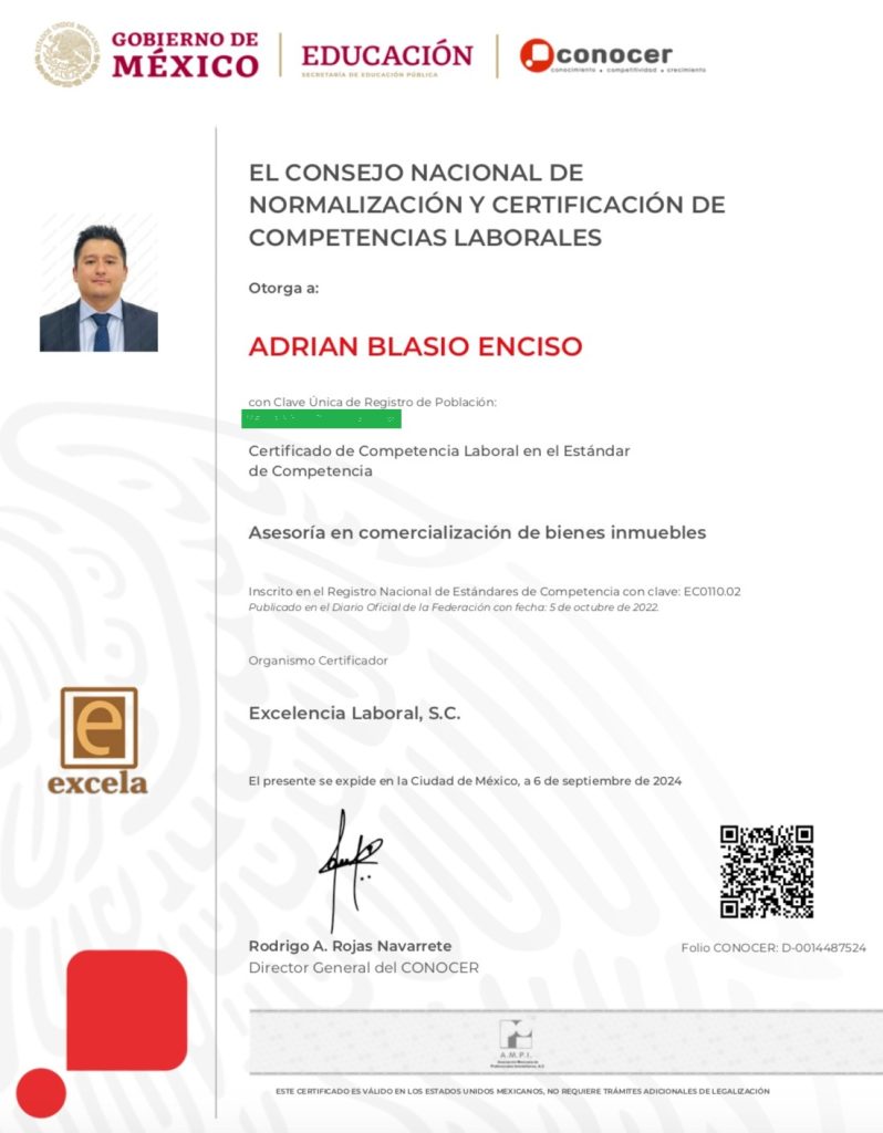 Adrián Blasio está certificado por la Secretaría de Educación Pública (SEP) en comercialización de bienes inmuebles.